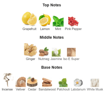 Amberwood ,Artemisia ,Bergamot ,Cedar ,Geranium ,Green Notes ,Iso E Super ,Lavender ,Lemon Zest Bitter ,Mint ,Pineapple ,Sandalwood ,Tonka Bean |