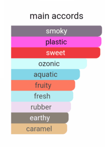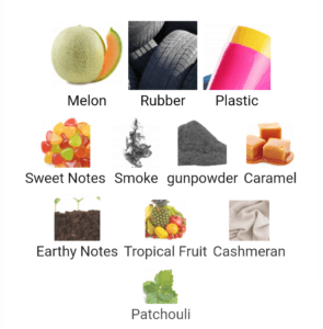 Caramel ,Cashmeran ,Earthy Notes ,gunpowder ,Melon ,Patchouli ,Plastic ,Rubber ,Smoke ,Sweet Notes ,Tropical Fruit |