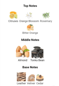 Almond ,Bitter Orange ,Cedar ,Citruses ,Leather ,Orange Blossom ,Rosemary ,Tonka Bean ,Vetiver |