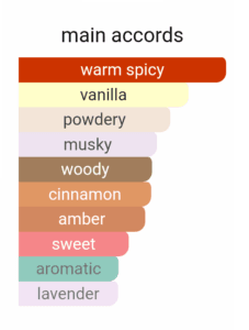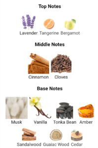 Amber ,Bergamot ,Cedar ,Cinnamon ,Cloves ,Guaiac Wood ,Lavender ,Musk ,Sandalwood ,Tangerine ,Tonka Bean ,Vanilla |
