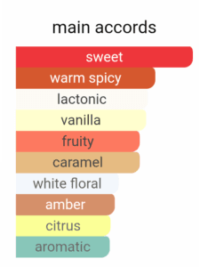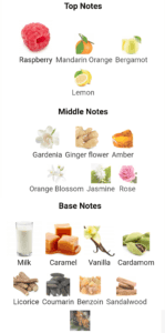 Amber ,Amberwood ,Benzoin ,Bergamot ,Caramel ,Cardamom ,Coumarin ,Gardenia ,Ginger flower ,Jasmine ,Lemon ,Licorice ,Mandarin Orange ,Milk ,Orange Blossom ,Raspberry ,Rose ,Sandalwood ,Vanilla |