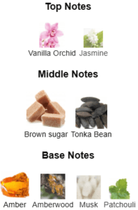 Amber ,Amberwood ,brown sugas ,Jasmine ,Musk ,Patchouli ,Tonka Bean ,vanilla orchid |