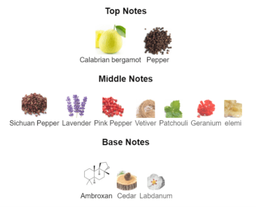 Ambroxan ,Calabrian bergamot ,Cedar ,elemi ,Geranium ,Labdanum ,Lavender ,Patchouli ,Pepper ,Pink Pepper ,Sichuan Pepper ,Vetiver |
